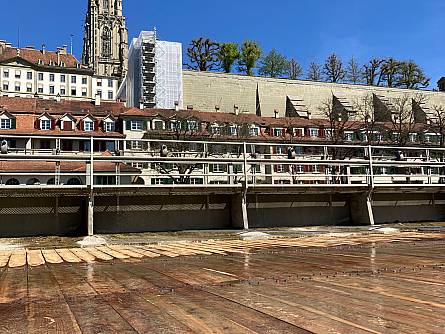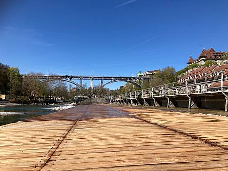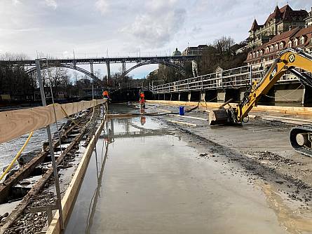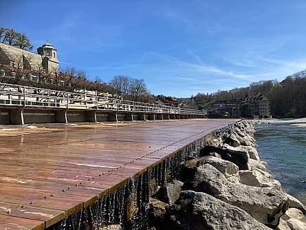 Inmitten der Aare hat Energie Wasser Bern (ewb) von Dezember 2024 bis April 2025 die Mattenschwelle erneuert. Die natürlichen Kräfte von Wasser und Geschiebe haben den Holzbrettern im Laufe der Jahre stark zugesetzt, weshalb sie nun im Rahmen des regulären Unterhalts ausgetauscht wurden. Diese Erneuerung ist von besonderer Bedeutung, da die Mattenschwelle ein integraler Bestandteil des UNESCO-Weltkulturerbes der Stadt Bern ist.